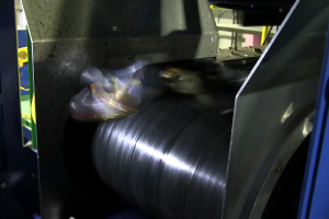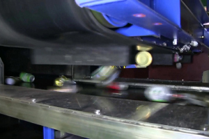 磁力選別装置では、磁力でスチール缶を引き付け鉄ホッパーに運びます。