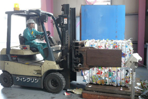 家庭から出された容器包装紙は、各自治体の収集運搬車で十勝リサイクルプラザ、第1工場に運ばれてきます。第1工場の容器包装紙処理ラインでは、収集された容器包装紙から不適物を取り除き、圧縮梱包しています。